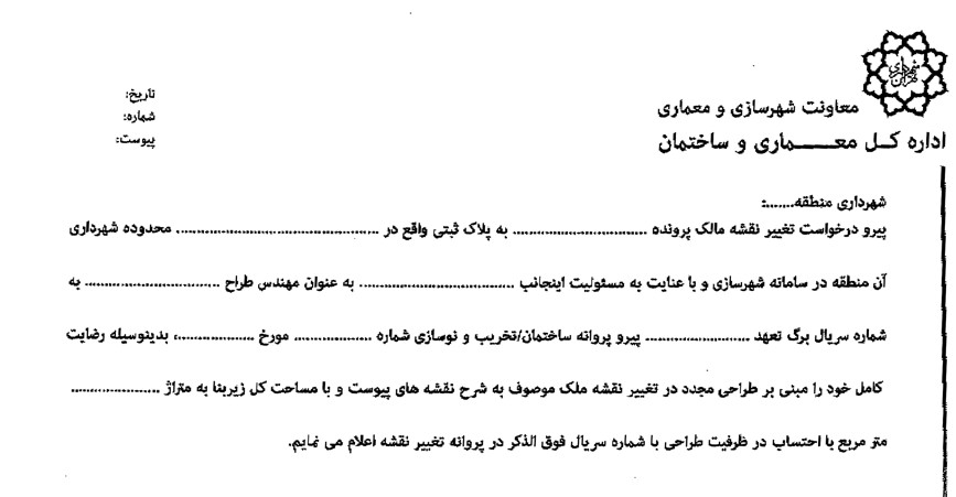 مدیر سایت۱۴۰۴/۱۰/۸ ۷:۳۰:۵۸دی 8, 1404|دسته بندی: شهرداری|کلیدواژه: تغییر نقشه, فرم اضافه متراژ, فرم رضایت طراح, فرم رضایت محضری طراح|۰ نظر